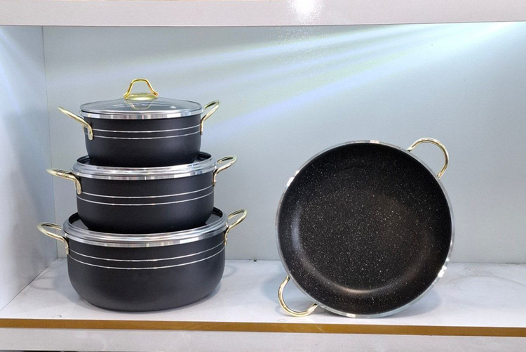 سرویس 7 پارچه طرح چدن داخل گرانیتی دسته طلایی،سرویس قابلمه،ست قابلمه و تابه
