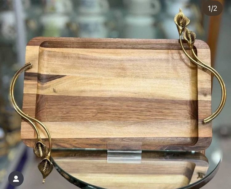 سینی چوبی دسته فلزی گل لیلیوم،سینی چای،سینی پذیرایی،سینی جدید